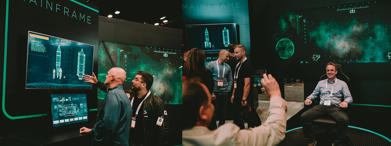 The Shopify Plus rocket ship for the IRCE conference involved integrated monitors showing synchronized motion graphics allowing participants to appear like they were in command of a starship. Multitouch screens allowed staff to demonstrate the capabilities of Shopify Plus through space age graphics.